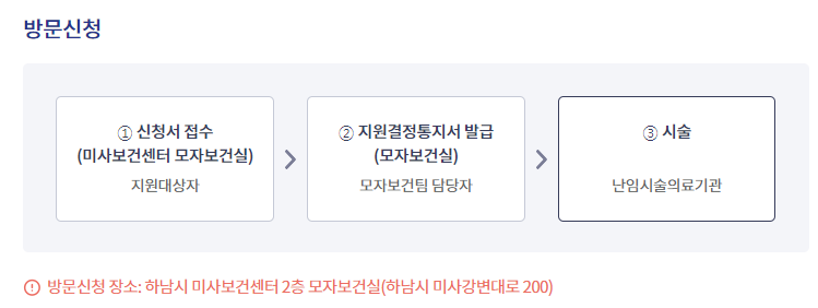 - 지원범위 : 체외ㆍ인공수정 시술비 중 일부 ㆍ 전액 본인 부담금 중 90%