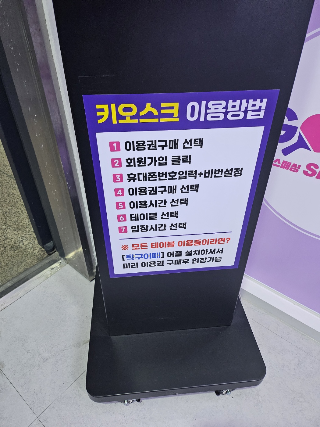 중간에 화장실 다녀오시려면 키오스크 화면에서 탁구장 입장(문열기) 선택후 핸드폰번호나 비밀번호 입력 후 입장이 가능해요.