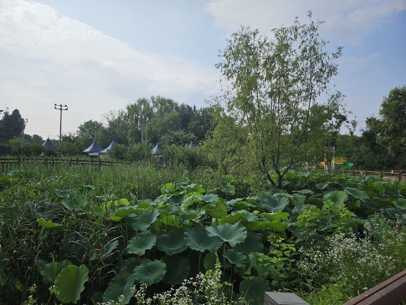 생태공원 컨셉으로 캠핑장 가운데 큰 연못이 있고 키가 큰 나무길도 있어서 시원한 바람이 불더라구요.