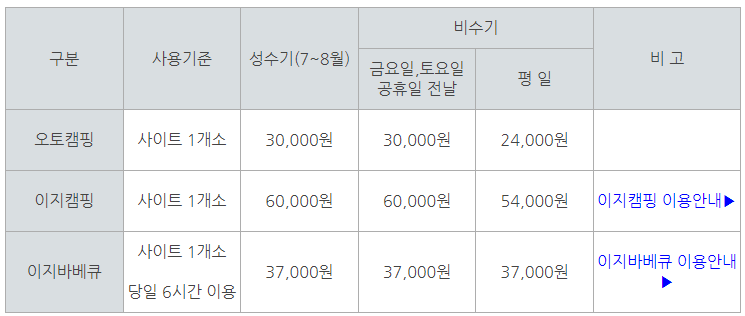 텐트가 없는데 캠핑을 하고 싶으시거나 날씨가 너무 더워서 텐트치기는 귀찮다 하시는 분은 이지캠핑을 이용해서 간편하게 캠핑을 즐 길 수도 있어요.