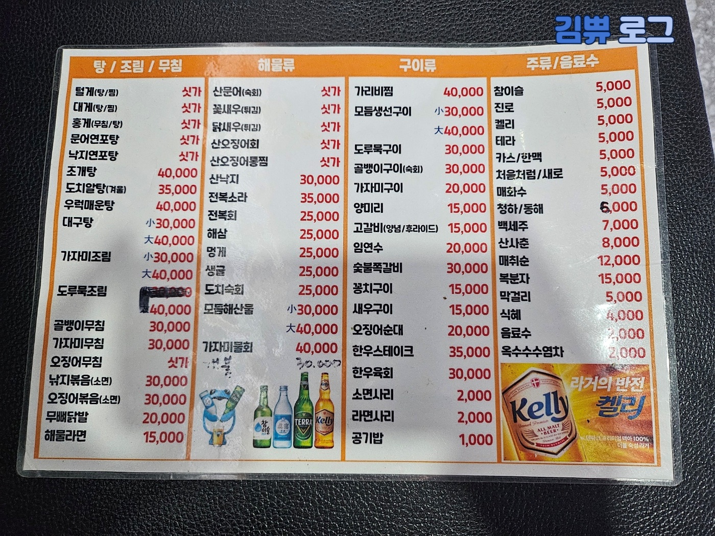 속초 당근마차 메뉴판이에요. 바닷가 근처에 있는 포차라 해산물 위주로 판매하고 있었어요.