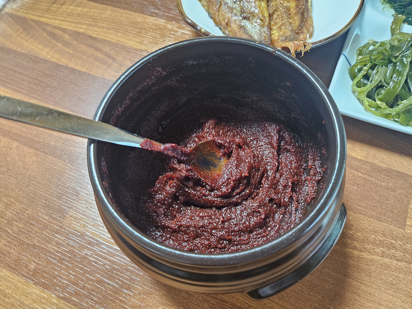 직접 담그신 대추 고추장이에요. 요즘 식당에서 직접 고추장을 담그는 곳이 별로 없는데