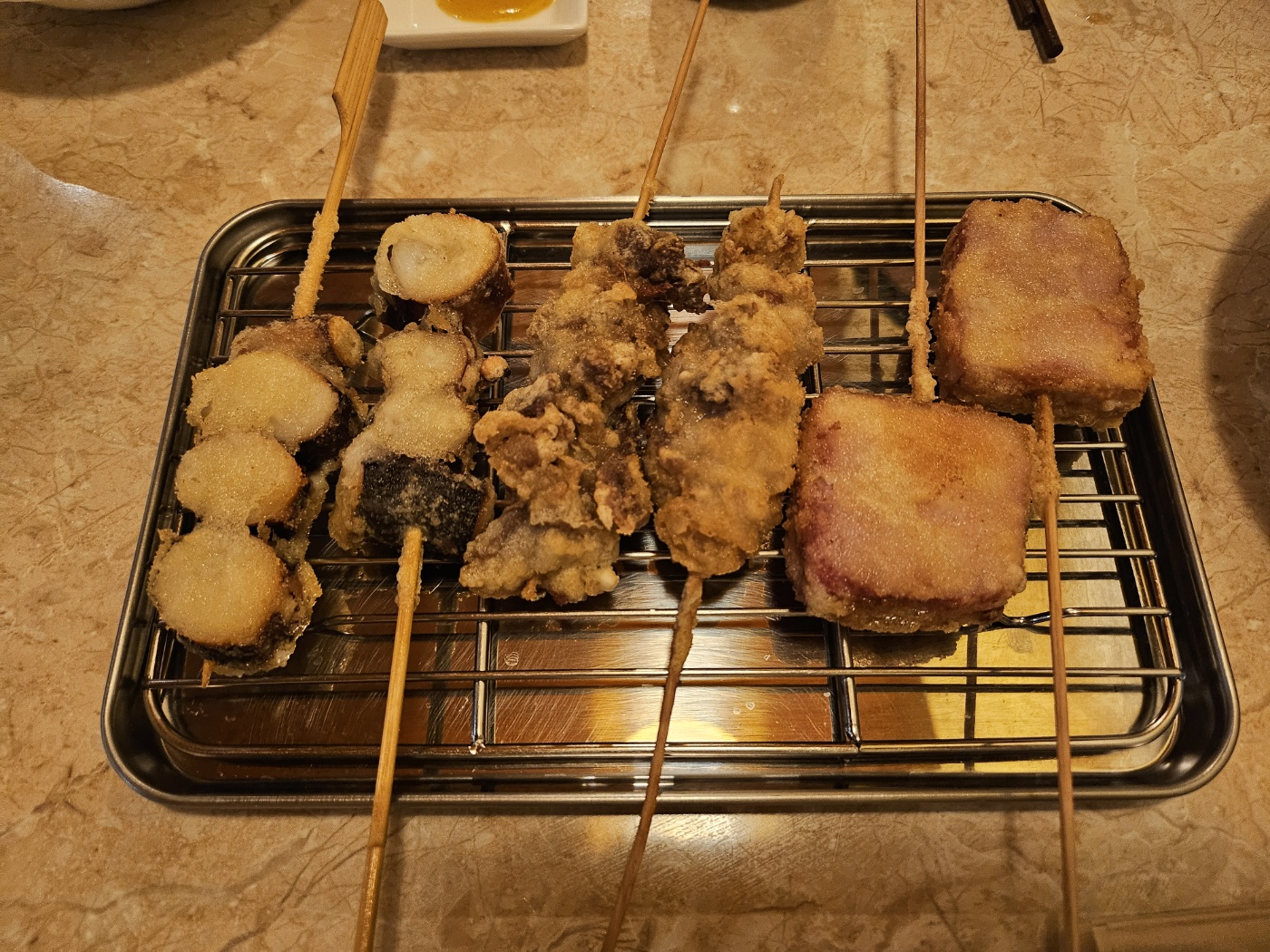 쿠시카츠 육류3종은 왼쪽에서부터 가문어튀김, 돼지고기튀김, 베이컨튀김으로 2개씩 나와요.
